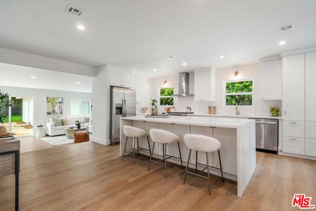 This stunning remodel is located in the much sought after Midvale Estates. Nestled behind elegant wrought iron gates, the front porch sets the tone for its inviting interior. Upon entry, you'll be captivated by the sunlit ambiance, and rich wood flooring throughout. The chef's kitchen is a true centerpiece, boasting a large stone-accented center island with a built-in sitting area, brand-new cabinetry, and top-of-the-line stainless steel appliances. It seamlessly flows into a step-down family room, complemented by a guest bathroom, pantry, and a dedicated laundry room. The luxurious primary suite offers a spa-inspired bathroom and a spacious walk-in closet. Additional highlights include a generously sized secondary bedroom, plus a versatile den/office with a closet, and another beautifully appointed full bathroom. Step outside to an expansive backyard oasis, ideal for al fresco dining and entertaining. Enjoy a lush lawn, fruit trees, a cozy firepit, a charming chicken coop, and ample space to add a pool. Conveniently located near popular dining spots, shopping centers, Lake Balboa, three golf courses, scenic bike paths, and public transportation, this exceptional property is truly a must-see.